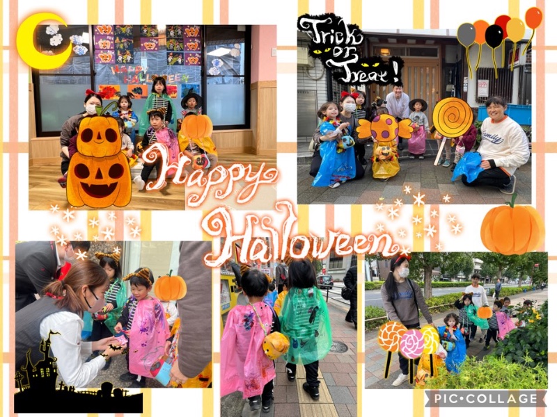 園周辺のお店を順番にまわり、「トリック・オア・トリート!」と声をかけながらお菓子をもらいました。